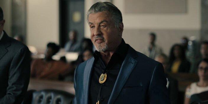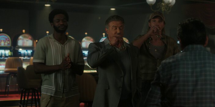 Сам Сталлоне двигается в сериале на свой возраст - 76 лет. Видно какие деревянные у него сейчас движения, все эти манерные, под мафию, подёргивания плечами, жесты руками - выглядят нелепо. Да, Сталлоне тоже мой кумир детства, но он всегда был никаким актёром. Напоминаю, что он один из рекордсменов "золотых малин". Сталлоне всегда брал харизмой и брутальностью, но тут её (на мой взгляд) не хватает. Однако отдаю должное, ему очень идут классические костюмы, хотя и живот в некоторых кадрах торчит сильнее груди. Для 76 он бодряком, очень даже бодряком, но возраст есть возраст.